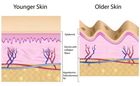 La piel joven tiene una dermis gruesa y abundante en una rica malla de fibras de colágeno y elastina (el tejido que sostiene la piel). A medida que envejecemos, las fibras de colágeno se vuelven más escasas y dañadas, con una menor capacidad para sostener la piel. Esto provoca flacidez y arrugas en la piel.